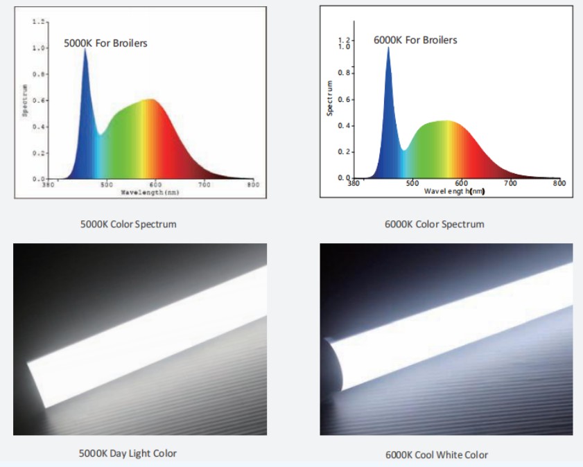 Для мясных кроссов, как при напольном, так и при клеточном содержании, компания «Агроконструктор» рекомендует использовать холодный белый свет с цветовой температурой 5000 К. Это не просто выбор цвета, а продуманное решение от Hontech-Wins, где каждый спектр света выполняет свою уникальную биологическую задачу:
