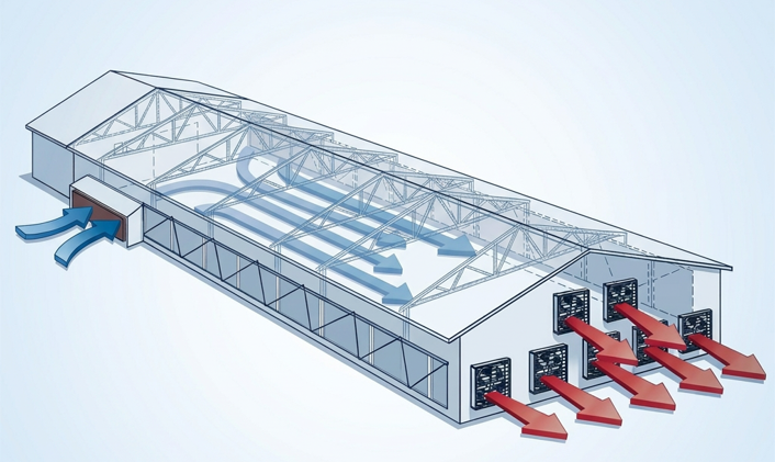 Конвекционное охлаждение (туннельная вентиляция): создает мощный поток воздуха, который охлаждает птицу за счет конвекции. Скорость воздуха на уровне птицы достигает 2,5 м/с. При этом важно обеспечить герметичность помещения и правильный расчет производительности вентиляторов.
