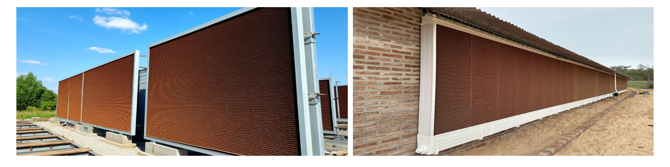 Система Pad Cooling : Гофрированные бумажные кассеты, через которые проходит вода. Горячий воздух, проходя через них, охлаждается за счет испарения. Требует расчета площади кассет исходя из производительности вентиляторов.