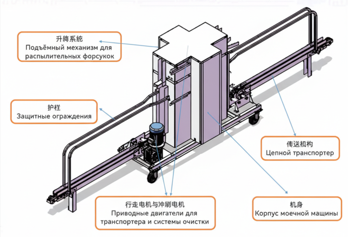 с форсунками, приводимая в движение подъёмным механизмом, совершает контролируемые