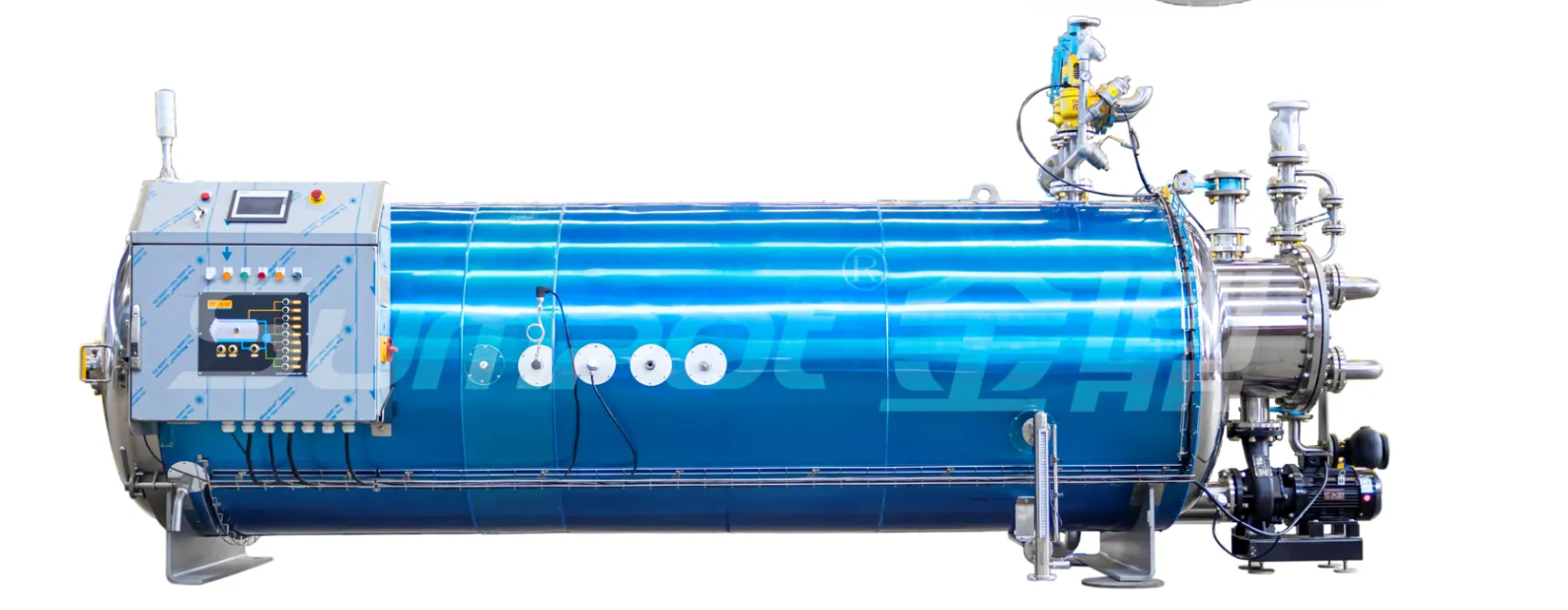 - Мощный насос циркулирует технологическую воду через автоклав и теплообменник.