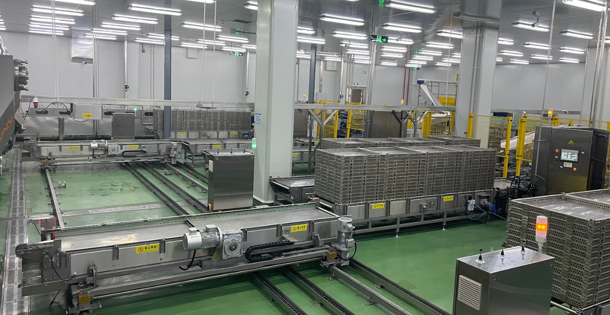 - Используется для автоматической загрузки, транспортировки и выгрузки корзин во время стерилизации консервированных/бутилированных продуктов.
